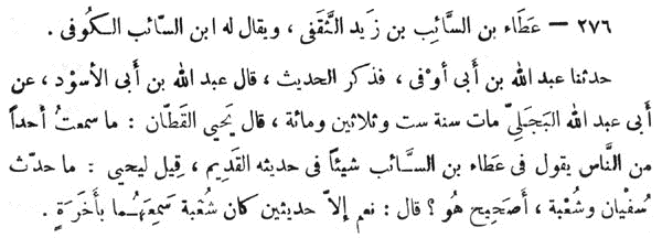 `Abd Allah Ibn Abi Awfa told us and he narrated the hadith. `Abd Allah Ibn Abi al-Aswad said, from Abu `Abd Allah al-Bajali: He died in 136 AH. Yahya al-Qattan said: I never heard anyone criticize `Ata' Ibn as-Sa'ib's old hadith. Yahya was told: Is what Sufyan and Shu`bah narrated sahih ? He said: Yes, except two hadiths that Shu`bah heard in his later days [Arabic: bi'akharah].[1]
