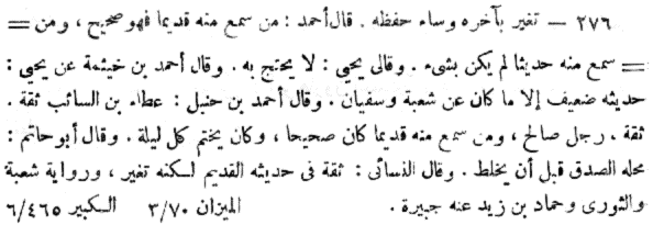 276 - He changed in his late days and his memory became bad. Ahmed said: Whoever hear of him early in his life, it is sahih, and whoever heard from him of late, it does not count. Yahya said: He does not count as an evidence. Ahmed Ibn Khaythamah narrated from Yahya: His hadith is weak baring what was transmitted by Shu`bah and Sufyan. Ahmed Ibn Hanbal said: `Ata' Ibn as-Sa'ib is thiqah, a pious man, and whoever heard from him early is sahih, he used to read through the Qur'an every night. Abu Hatim said: His rank is that of truthfulness before he got confused. Al-Nasa'i said: thiqah in his old hadith but he changed [in his later days] and his narrations through Shu`bah, al-Thawri and Hammad Ibn Zayd is fine [consolidated?]. [refer to al-Mizan 70/3 and al-Kabir 465/6][2]