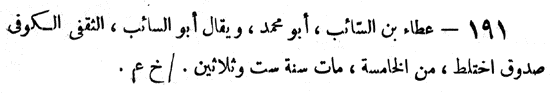 191 - `Ata' Ibn al-Sa'ib, Abu Muhammad, also called Abu as-Sa'ib, al-Thaqafi al-Kufi, truthful but got confused.... [4]
