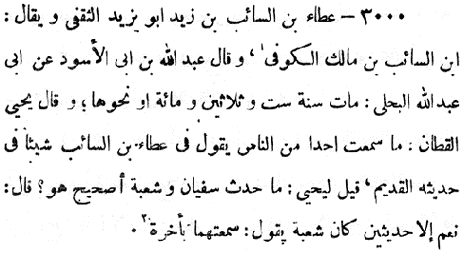 3000 - `Ata' Ibn al-Sa'ib Ibn Zayd, Abu Yazid, al-Thaqafi. It is also said: Ibn as-Sa'ib Ibn Malik al-Kufi. `Abd Allah Ibn Abi al-Aswad said, from Abu `Abd Allah al-Bajali: He died in 136 AH or so. Yahya al-Qattan said: I never heard anyone criticize `Ata' Ibn as-Sa'ib's old hadith. Yahya was told: Is what Sufyan and Shu`bah narrated sahih? He said: Yes, except two hadiths. Shu`bah said: I heard them in his late days [Arabic: bi'akharah].[3]