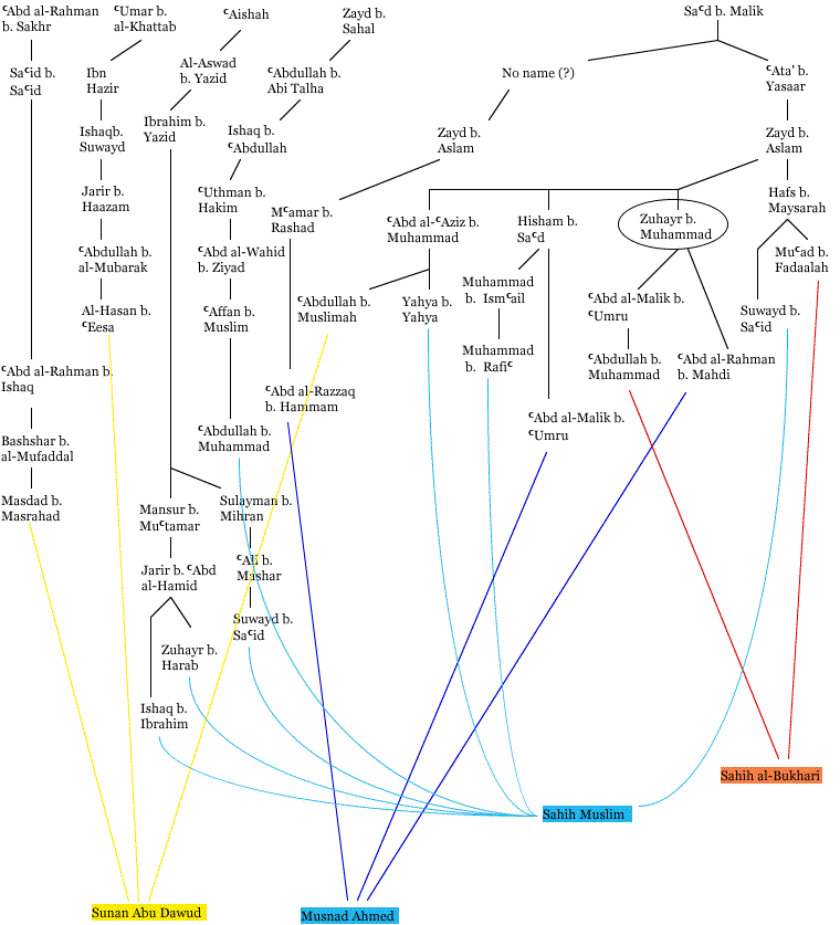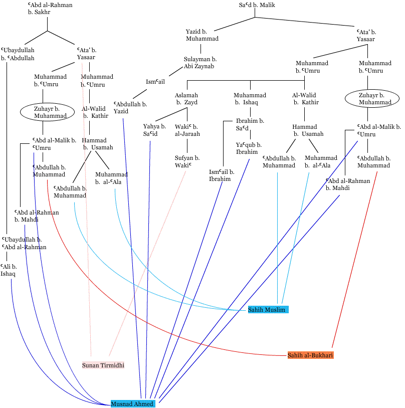 It is interesting to note that Ahmed uses a shorter isnad than al-Bukhari for the same hadith. Ahmed, Muslim and Tirmidhi collected the same hadith that is independent of Zuhayr.