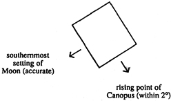 Figure 11: The orientation of rectangular base of the Kaaba towards the rising of Canopus and summer solstice, as recorded in various medieval sources, the earliest dating from the 7th century. The 'cardinal' winds are shown, each one striking a wall of Kaaba head-on. The rising point of Canopus is accurate to within 2°.[28,29]