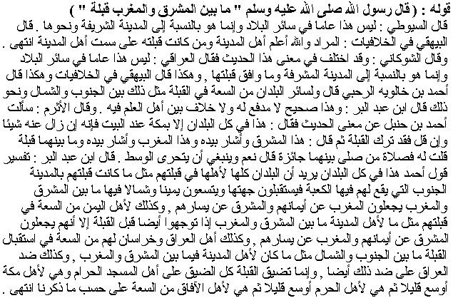 Al-Suyuti said: "This is not a general statement about every country, it only applies to al-Madinah and its likes." Al-Bayhaqi said in Al-Khilafiyyat [The Controversial Matters]: "Those who are meant [by this hadith], and Allah knows best, are the inhabitants of al-Madinah and whoever his qibla is the same as the people of al-Madinah." Al-Shawkani said: "There has been a disagreement about the meaning of this hadith." Al-ʿIraqi said: "This is not a general statement about all countries, it is rather a applicable to Al-Madinah and any spot having the same qibla and this was the opinion of al-Bayhaqi in Al-Khilafiyyat and that of Ahmad ibn Khaluweih al-Rahbi who said: the other countries have a similar room in determining the qibla between South and North." Likewise, ibn ʿAbd al-Barr said: "This is correct and cannot be refuted and there is no disagreement between the scholars about it." Al-Athram said: "I asked Aḥmad ibn Ḥanbal about the meaning of this hadith, he said: "This is applicable to all countries except Makkah at the House, shifting from it slightly is no less than missing the qibla." Then he said: "This is the East" and he pointed towards it, and "this is the West" and pointed towards it and between them is a qibla. I told him: "Whoever heads between them in his prayer, his prayer is valid. He said: "Yes, and he must seek the middle." ibn ʿAbd al-Barr commented on Ahmad's statement "This is applicable to all countries" saying that he means all the countries who like al-Madinah head towards the South where the Kʿabah is located and so they head towards it and can go aside to the right and to the left between the East and the West putting the West on their righthand side and the East on their lefthand side. Similarly, the people of Yemen have the same flexibility in their qibla between the East and the West, when they head towards the qibla they out the East on their righthand side and the West on their lefthand side. Similarly, the people of Iraq and Khurasan have the same room in facing the qibla between the South and the North. The people at the opposite to Iraq face at the opposite of this. The qibla is restricted only for the people in the Holy Mosque. It widens a little for the inhabitants of Makkah, and widens a little more for the people of the Haram [the precincts of the Holy Land] and then it is as wide as described earlier for the people of other locations".