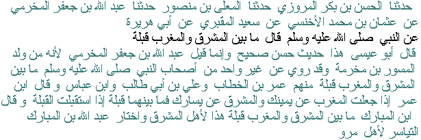 Al-Hasan ibn Bakr al-Marwazi told us, al-Muʿalla ibn Mansur narrated to us on the authority of ʿAbdullah ibn Jaʿfar al-Makhrami from ʿUthman ibn Muhammad al-Akhnasi from Saʿid al-Maqbari from Abu Hurayrah that the Prophet, peace be upon him, said: "Between the East and the West is a qibla." Abu ʿIsa said: "This hadith is hasan sahih. The narrator was called ʿAbdullah ibn Jaʿfar al-Makhrami because he is the son of al-Miswar ibn Makhramah. Several people among the Companions of the Prophet, peace be upon him, narrated that between the East and the West is a qibla among them are ʿUmar ibn al-Khaṭṭāb, ʿAli ibn Abi Talib, ibn ʿAbbas and ibn ʿUmar said: "If you let the West on your right hand side and the East on the lefthand side, wherever in between is a qibla if you are seeking to head towards the qibla. ibn al-Mubarak said: "Anywhere between the East and the West is a qibla this is for the people of the East." And he chose for the people of Marw [a location in Persia] to head to the left.