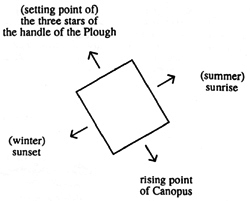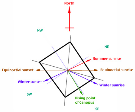 Figure 11: The orientation of rectangular base of the Kaaba towards the rising of Canopus and summer solstice, as recorded in various medieval sources, the earliest dating from the 7th century. The 'cardinal' winds are shown, each one striking a wall of Kaaba head-on. The rising point of Canopus is accurate to within 2°.[28,29]