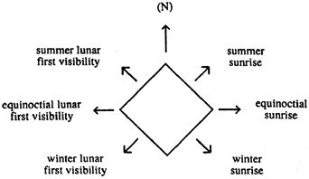 Astronomical alignments were used for the qibla because the fiirst generation of Muslims who were familiar with Kʿabah knew that when they stood in front of the edifice, they were facing a particular astronomical direction. In order to face the appropriate part of the Kʿabah which was associated with their ultimate geographical location, they used the same astronomically-defined direction for the qibla as they would have been standing directly in front of that particular segment of Kʿabah. This notion of qibla is, of course, quite different from that used by astronomers. Such simple methods for finding the qibla by astronomical horizon phenomena are outlined in the legal texts and in treatises dealing with folk astronomy. In medieval sources, we also find qibla directions expressed in terms of wind directions. Several wind schemes defined in terms of solar or steller risings and settings, were part of the folk astronomy and meteorology of pre-Islamic Arabia [as shown in the Figure below]. The folk astronomy flourished along with the mathematical astronomy (from 3rd / 9th century onwards), but was far more widely known and practiced.