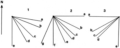 Figure 13: Different qibla directions that were used at different times for (1) Cordova, (2) Cairo, and (3) Samarqand, according to various medieval sources.