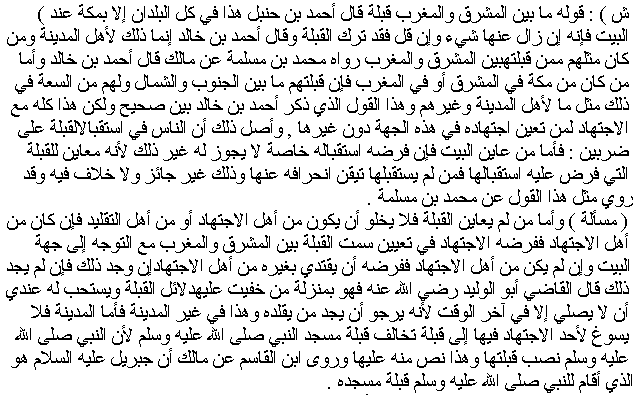 Concerning "[Anywhere] between the East and the West is a qibla", Aḥmad ibn Ḥanbal said: "This applies to all countries except in Makkah at the House [i.e., the Sacred Mosque] where whoever shifts from it has missed the qibla." Ahmad ibn Khalid said: "This hadith applies to the inhabitants of Madinah and whoever is like them whose qibla is between East and West", narrated by Muhammad ibn Maslamah from Malik. Ahmad ibn Khalid said: "As for those who are located to the East of Makkah or to the West, their qibla is between South and North and they have room in that [i.e., flexibility in the determination of the direction] as much as the inhabitants of Madinah and others have." This opinion mentioned by Ahmad ibn Khalid is clear and correct but it goes in pairs with the effort [ijtihad] for whoever is knowledgeable in this respect. This is due to the fact that in their facing the qibla the people are in two categories. First, those who can see the House must head towards it and it is not permissible for them to do otherwise because it is mandatory for those who see the qibla to follow it and whoever does not has shifted from it undoubtedly, which is not permissible and there is no disagreement about that. A similar opinion has been narrated from Muhammad ibn Maslamah.