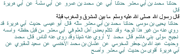 Muhammad ibn Abi Maʿshar told us, my father told us on the authority of Muhammad ibn ʿAmr from Abu Salamah from Abu Hurayrah that the Messenger of Allah, peace be upon him, said "[Anywhere] between the East and the West is a qibla." Yahya ibn Musa narrted to us on the authority of Muhammad ibn Abi Maʿshar likewise. Abu ʿIsa said: "The hadith of Abu Hurayrah has been narrated through other ways. Some scholars have spoken about Abu Maʿshar with regards of his [bad] memory, his name is Nujayh the freed slave of Banu Hashim." Muhammad [al-Bukhari] said: "I don't narrate anything from him while the people have narrated from him". Muhammad said: "The hadith of ʿAbdullah ibn Jaʿfar al-Makhrami from ʿUthman ibn Muhammad al-Akhnasi from Saʿid al-Maqbari from Abu Hurayrah is sounder and more authentic than the hadith of Abu Maʿshar".