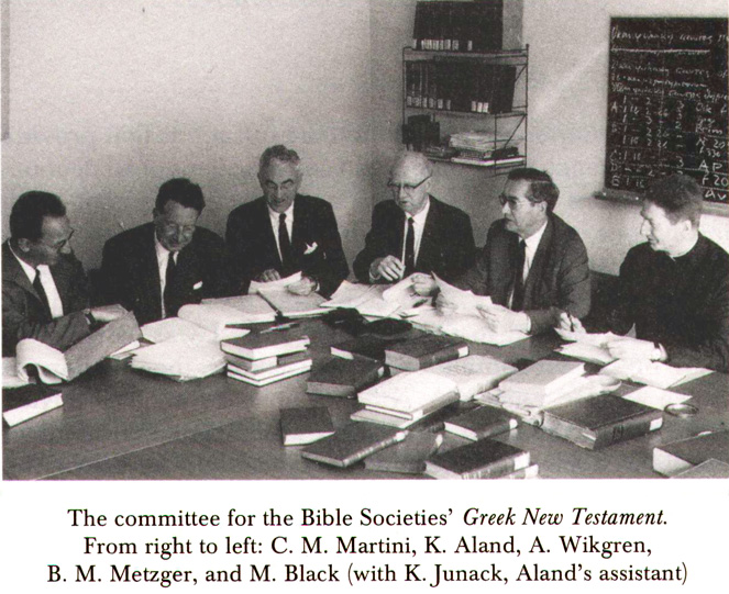 The committee for the United Bible Societies' Greek New Testament at one point of time consisted of Kurt Aland, Matthew Black, Bruce Metzger, Allen Paul Wikgren and Carlo Maria Martini. The picture below shows them involved in discussions dealing with textual variants in the Greek New Testament. Also notice that on the blackboard, the manuscripts with their short-hand notation are depicted against the letters A, B, C and D for a reading.