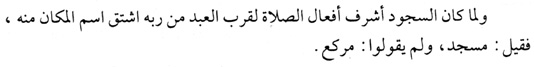 Since prostration is the most honourable act in prayer because of the nearness of the servant to his Lord, the name of the location was derived from it. This is why we call it masjid [location of sujud / prostration] and not marka` [place of ruku` / inclination].[7]