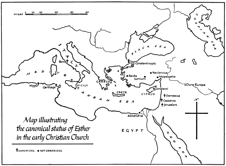 Figure 2: Map showing the canonical status of Esther in the early Christian Church.[56] Notice that the Book of Esther was considered non-canonical in Constantinople, Sardis, Iconium, Nazianzus, Mopsuestia and Alexandria. On the other hand, Esther was considered canonical in Rome, Hippo, Carthage, Damascus, Caesarea, Jerusalem, Constanti and Constantinople. There appears to be two views of the books canonicity at Constantinople.