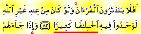 Now, what a clever logician would do is to simply treat ikhtilafan as a word and not consider its meaning and start counting number of its occurrences in the Qur'an. This would simply enable him to check whether the author of the Qur'an understands the difference between use and mention of the word. The clever logician would find that the word ikhtilafan occurs only once in the Qur'an, i.e., in the above verse.[1] Therefore, had the Qur'an been from any other than Allah, the logician would surely have found therein many ikhtilafan.