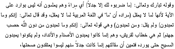 Regarding His divine words: "This they set forth to thee, only by way of disputation: yea, they are a contentious people" means: they say so for the sake of argument while they know that their argument is not applicable to this verse since it refers to things only [i.e., in the Arabic language "mâ" is used to refer to things and God Almighty used "mâ" and not "man"] and so it is in His divine speech "Verily ye and what ye serve other than God is the fuel of hell." Moreover, this verse was addressed at Quraysh who were used to worship idols and they did not worship Jesus so that he could be included here. Therefore, their answer is no more than a fake argument in which they do not believe themselves.[4]