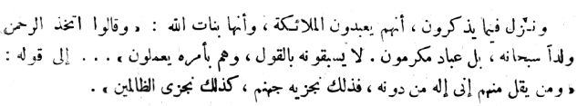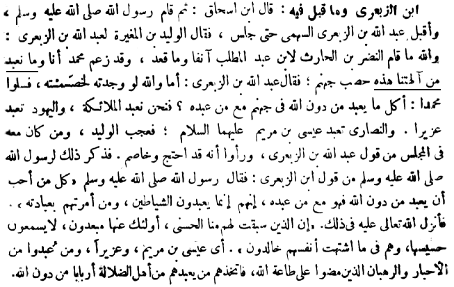 Then the Apostle of God(P) left and cAbdullâh Ibn al-Zibicrâ as-Sahmî came and sat down. al-Walîd said to him: "By God, an-Nadr could not stand up to the (grand)son of cAbdul-Muttalib just now and Muhammad alleged that we and what we worship among these deities of ours [mâ nacbudu min 'âlihatinâ hâdhihî] are fuel for hell". cAbdullâh Ibn al-Zibicrâ said: "If I had found him I would have refuted him. Ask Muhammad, "Is everything which is worshipped besides God in hell with those who worship it?' We worship the angels; the Jews worship cUzayr; and the Christians worship Jesus the Son of Mary." Al-Walîd and those with him in the assembly wondered at the words of cAbdullâh Ibn al-Zibicrâ and saw that he had argued convincingly. When the Apostle of God(P) heard of the speech of Ibn al-Zibicrâ, he said: "Everyone who appreciates being worshipped to the exclusion of God will be with those who worship him. They worship only devils and whom they have ordered to be worshipped." So God Almighty revealed concerning that "Those who have received kindness from us in the past will be removed far from it and will not hear its sound and they abide eternally in their heart's desire", i.e., Jesus Son of Mary and cUzayr and those rabbis and monks who have lived in obedience to God, whom the erring people worship as lords beside God. And He revealed concerning their assertion that they worship angels and that they are the daughters of God, "And they say the Merciful has chosen a son, (exalted be He above this); nay, they are but honored slaves, they do not speak before He speaks, and they carry out His commands", as far as the words, "and he of them who says, I am God as well as He, that one we shall repay with Hell. Thus do they repay the sinful ones." [1]