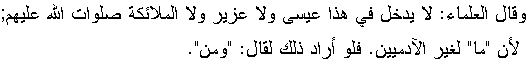 The scholars say that Jesus, cUzayr and the angels are not meant by verse 21:98 because "mâ" [i.e., "what"] refers to inanimate things and not to people. If the verse pointed to them, it would use "man" [i.e., "who" or "whom"] instead.[3]