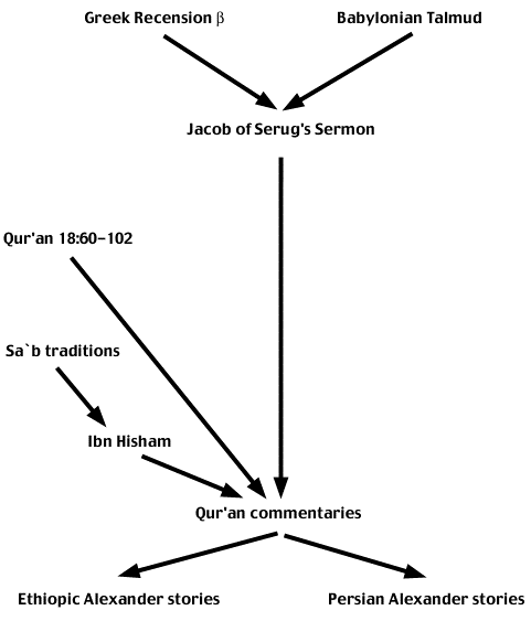 [8] See for example: I. Friedländer, Die Chadhirlegende Und Der Alexanderroman, 1913, Druck Und Verlag Von B. G. Teubner: Leipzig, p. 278; J. Horovitz, Koranische Untersuchungen, 1926, Walter De Gruyter: Berlin & Leipzig, p. 111; A. R. Anderson, "Alexander's Horns", Transactions And Proceedings Of The American Philological Association, 1927, Volume LVIII, pp. 110-111; A. R. Anderson, Alexander's Gate, Gog And Magog, And The Inclosed Nations, 1932, The Mediaeval Academy Of America: Cambridge, MA, pp. 29-30; C. C. Torrey, The Jewish Foundation Of Islam, 1967, Ktav Publishing House, Inc.: New York, p. 35 and 125.; A. Jeffery, The Koran: Selected Suras, 1958, The Heritage Press: New York, NY, p. 220, n. 9; J. A. Boyle, "The Alexander Romance In The East And West", Bulletin Of The John Rylands University Library Of Manchester, 1977, Volume 60, pp. 19-20.; M. S. Southgate, Iskandarnamah: A Persian Medieval Alexander Romance, 1978, Columbia University Press, New York, p. 201; Ibn Warraq, Why I Am Not A Muslim, 1995, Prometheus Books: Amherst, NY, p. 61; A. Rippin, Muslims: Their Religious Beliefs And Practices, 2003, Routledge, p. 22.