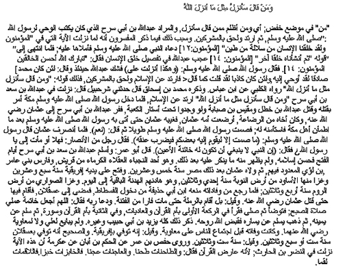 He also reported from al-Baidawî commenting on the the verse 6:93 that the reason that triggered apostasy of cAbdullâh Ibn Sâd Ibn Abî Sarh was the revelation of the verse 23:12. The following is the translation of Baidawî's report proposed by the critic: