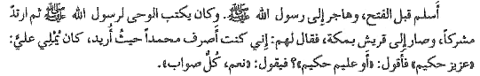 He converted to Islam before the conquest of Mecca and immigrated to the Prophet(P) [i.e. in Medina]. He used to record the revelation for the Prophet(P) before he apostatized and went back to Mecca. Then he told Quraysh: 'I used to orient Muhammad wherever I willed, he dictated to me "All-Powerful All-Wise" and I suggest "All Knowing All-Wise" so he would say: "Yes, it is all the same."[1]