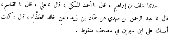 Khalaf b. Ibrahim said: Ahmad al-Makki told me: Al-Qasim told me:‘Abd al-Rahman b. Mahdi told me from Hammad b. Zayd; from Khalid al-Hadda': I used to follow a mushaf from Ibn Sirin [d. 110 AH / 728 CE] that was dotted.[54]