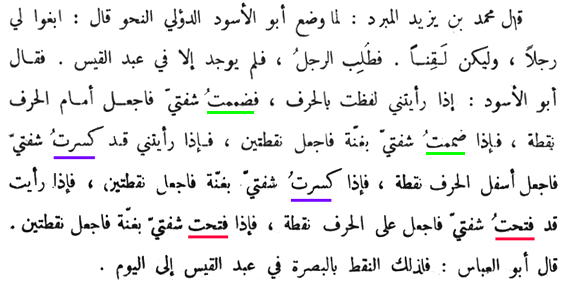 Muhammad Ibn Yazid al-Mubarrid said : When Abu al-Aswad ad-Du'ali formalized the grammar, he said : "Seek me a man skilled at taking notes." We looked for such a man, and could not find anyone except in (the tribe of) ‘Abd al-Qays. Abu al-Aswad told him : "When you see me pronounce a letter, if I bring my lips together [fa-dammatu], put a dot before the letter; if I bring my lips together [fa-dammatu] with nasalization, put two dots before it. If I lower my lips [kasrtu], put a dot beneath the letter; if I lower my lips [kasrtu] with nasalization, put two dots beneath it. If you see me open my lips [fathatu], put a dot above the letter; if I open my lips [fathatu] with nasalization, put two dots above it.
