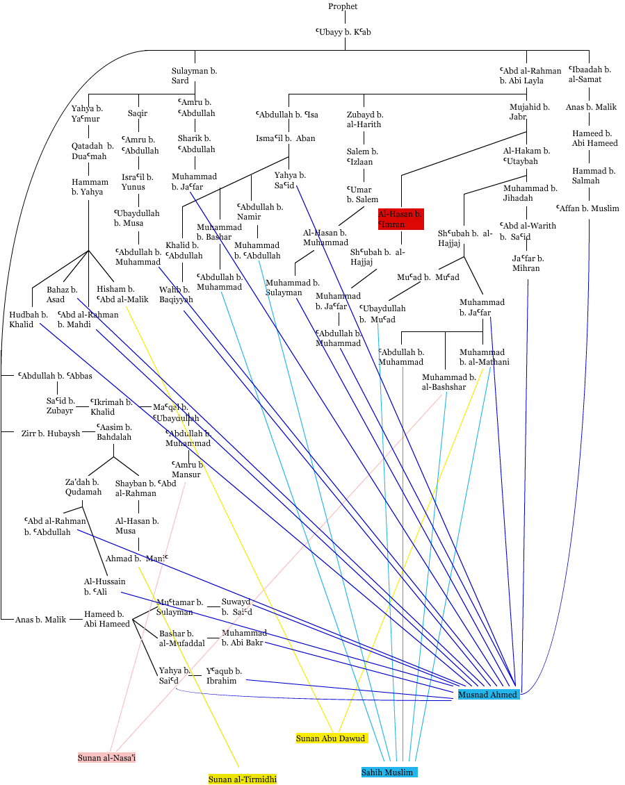 The isnad bundle of ‘Ubayy's hadith in the well-known collections of hadiths is given below.[45]