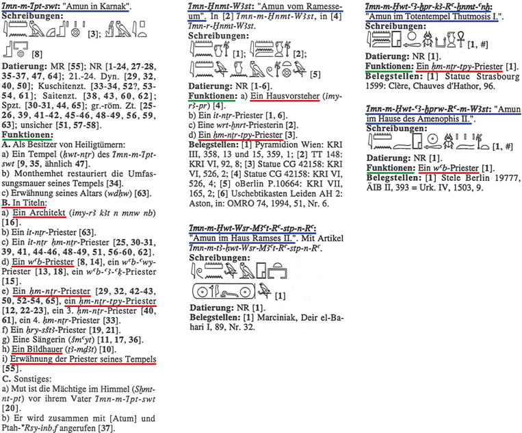 [194] Apart from the earlier mention of "ḤMN" and "’IMN", the are numerous examples of the priest of a temple in ancient Egypt being referred to in the title by the name of the deity of that temple.