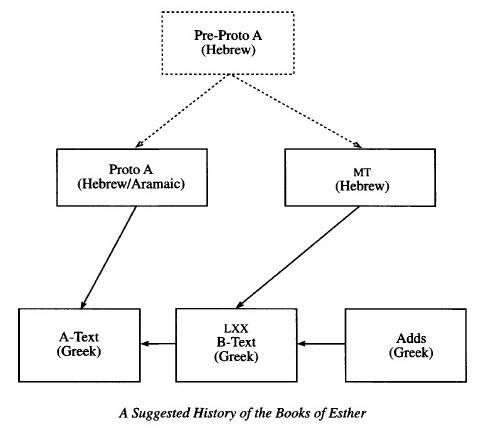 The Proto A and Pre-Proto A posited by Fried are meant to establish where the “Ur-Text” resides [Figure 1]; they do not exist in documentary form. It is important to remember though that the three versions that have been discussed so far are based on real documents and have not been conjectured. Therefore, from the standpoint of its textual transmission, it is clear that the text of Esther has never been ‘fixed’, existing today in different versions.[53] Proceeding from Esther’s fluid transmissional history, early Jews and Christians were led to dispute its canonicity.