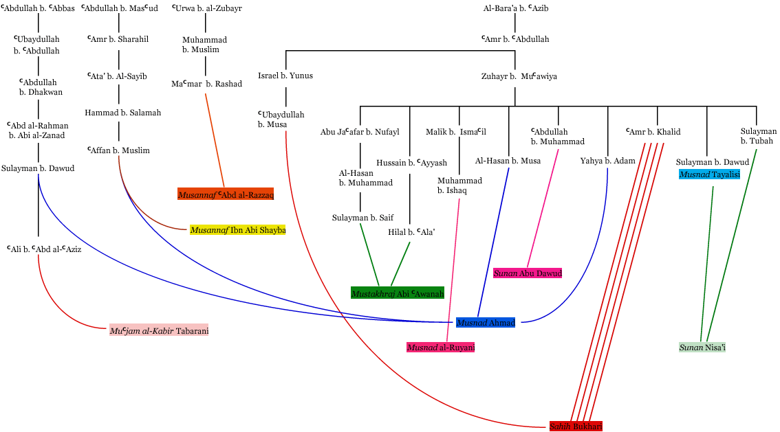 Is that the final word on the dating of this ḥadīth? An analysis of the isnād bundle suggests that the tradition from al-Barā'a ibn ʿAzib intersects at Zubayr ibn Muʿawiya [d. 174 AH / 790 CE]. He is the common link.