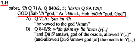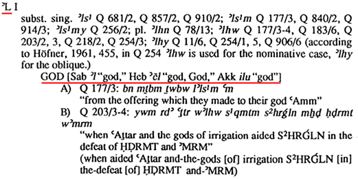[144] J. C. Biella, Dictionary Of Old South Arabic: Sabaean Dialect, 1982, Harvard Semitic Studies No. 25, Scholars Press: Chico (CA), p. 15; Also see A. F. L. Beeston, M. A. Ghul, W. W. Müller & J. Ryckmans, Sabaic Dictionary (English-French-Arabic), 1982, Publication Of The University Of Sanaa (Yar), Editions Peeters: Louvain-la-Neuve and Librairie du Liban: Beirut, p. 5.