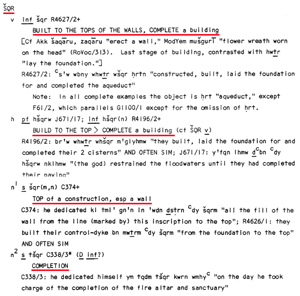[114] J. C. Biella, Dictionary Of Old South Arabic: Sabaean Dialect, 1982, Harvard Semitic Studies No. 25, Scholars Press: Chico (CA), p. 15; Also see A. F. L. Beeston, M. A. Ghul, W. W. Müller & J. Ryckmans, Sabaic Dictionary (English-French-Arabic), 1982, Publication Of The University Of Sanaa (Yar), Editions Peeters: Louvain-la-Neuve and Librairie du Liban: Beirut, p. 5.