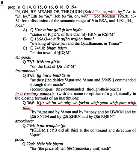 [38] J. C. Biella, Dictionary Of Old South Arabic: Sabaean Dialect, 1982, Harvard Semitic Studies No. 25, Scholars Press: Chico (CA), p. 485; Also see A. F. L. Beeston, M. A. Ghul, W. W. Müller & J. Ryckmans, Sabaic Dictionary (English-French-Arabic), 1982, op. cit., pp. 116-117.