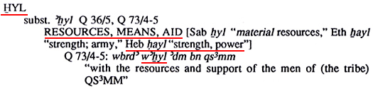 The inscription adds an important phrase before rḥmnn, i.e., bkhyl, which the missionaries conveniently left out in order to label Beeston's translation as "dubious". Anyone familiar with epigraphic South Arabian would immediately recognize bkhyl as a phrase associated in situations where there is an invocation, i.e., b-khyl. So, what are b and khyl in epigraphic South Arabian? Let us check the lexicons of epigraphic South Arabian to answer this question. The convention for depicting consonant kh is ḫ in epigraphic south Arabian.